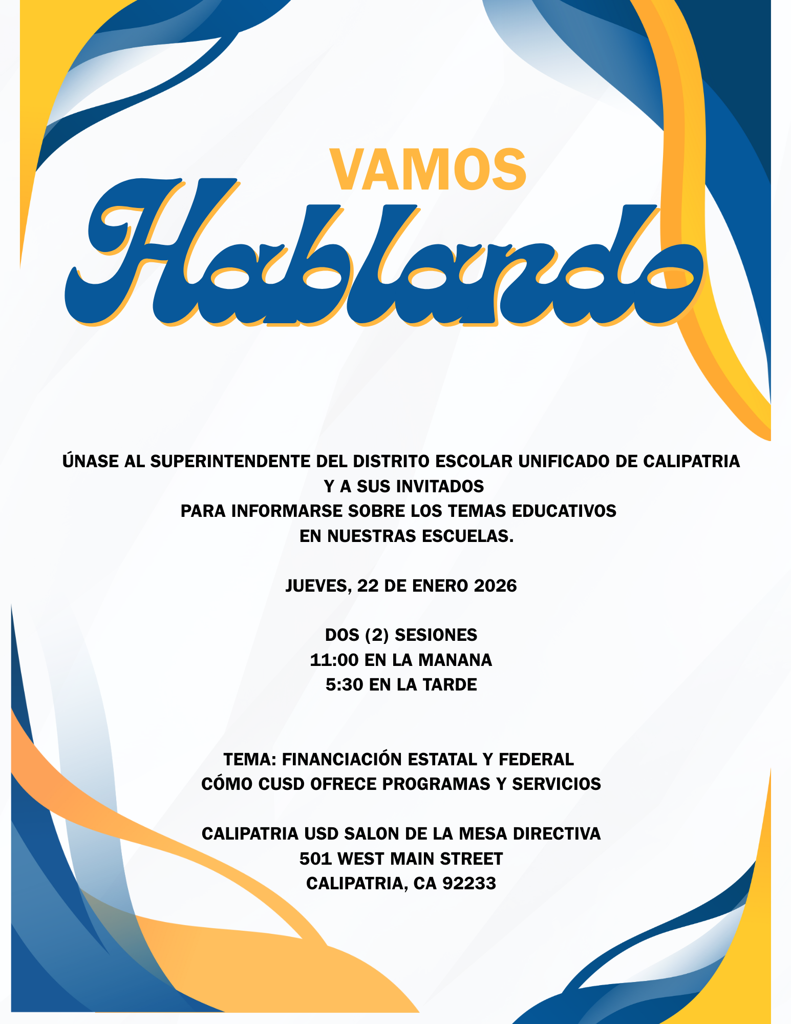 Únase a la superintendente del Distrito Escolar Unificado de Calipatria, Angelita Ortiz, y a sus invitados para informarse sobre temas educativos de actualidad en nuestras escuelas. Las primeras charlas están programadas para el jueves 22 de enero de 2026. Se ofrecerán dos sesiones: a las 11:00 a. m. y a las 5:30 p. m. Lugar: CUSD Board Room. Agradecemos su participación y sus comentarios.