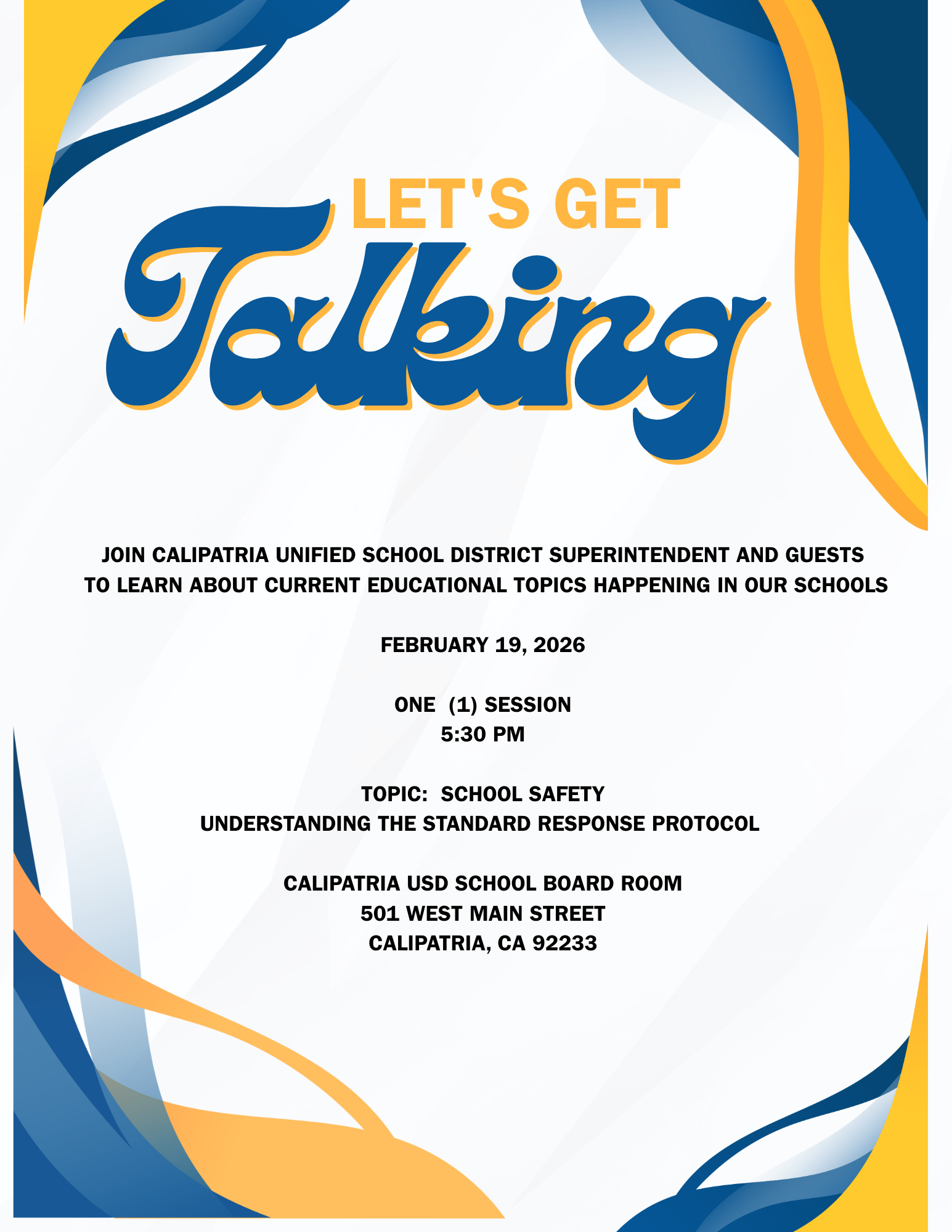 Join the Calipatria Unified School District Superintendent, Angelita Ortiz, and her guests to learn about current educational topics happening in our schools. The next talk is scheduled for Thursday February 19, 2026. One session will be offered at 5:30 PM. Location: CUSD Board Room. We welcome your participation and input.